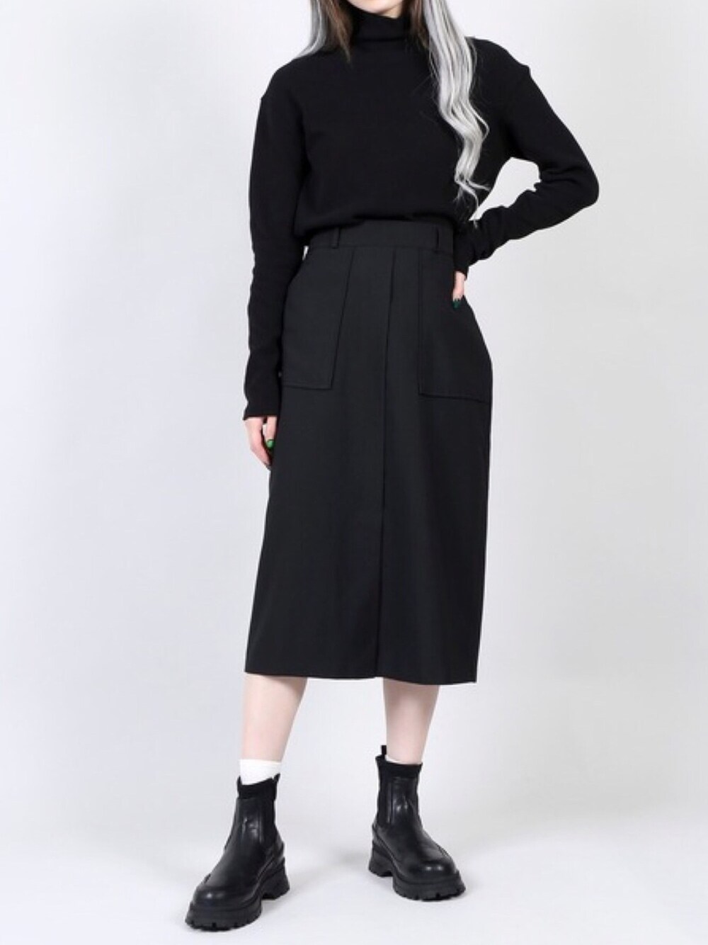 ベイカーロングスカート color:black/beige size:free ハイネックロングTシャツ color:black/white size:free