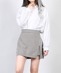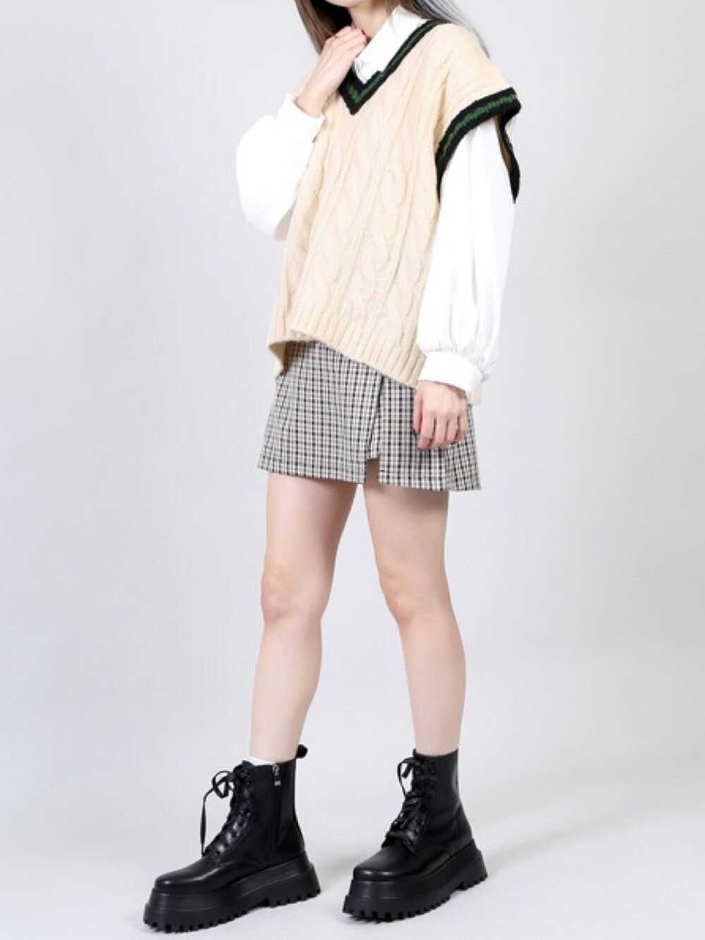 オーバーチルデンニットベスト color:off white/brown/navy size:free ボリューム袖シャツ color:white/black/pink/beige size:free チェックスリットミニスカパン color:beige/green size:free