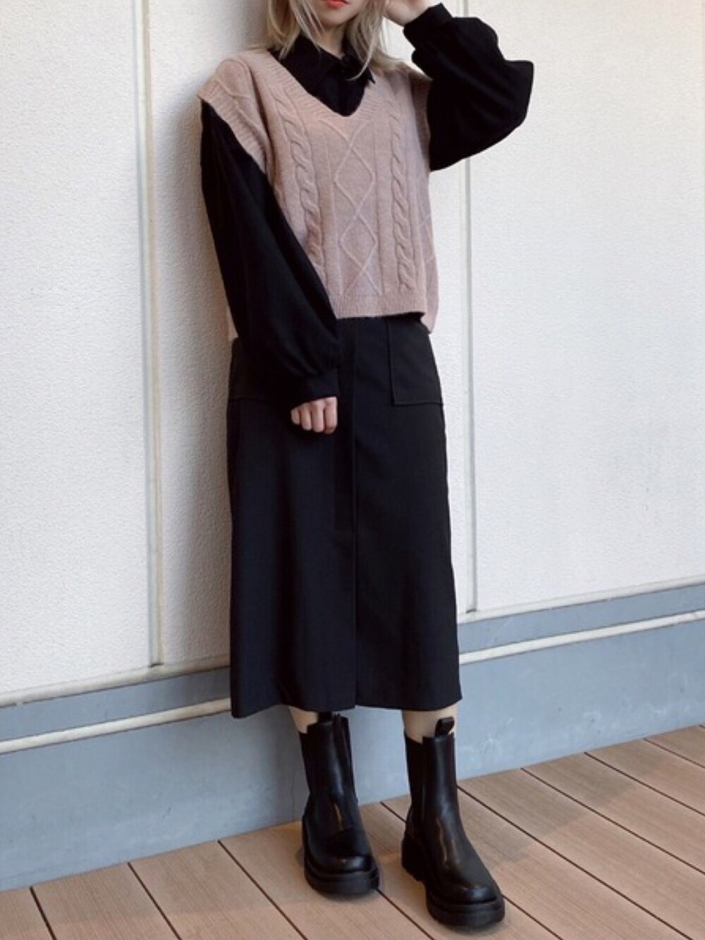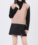 ケーブルニットベスト color:beige/blue/off white size:free ボリューム袖シャツ color:black/beige/white/pink size:free ベイカーロングスカート color:beige/black size:free