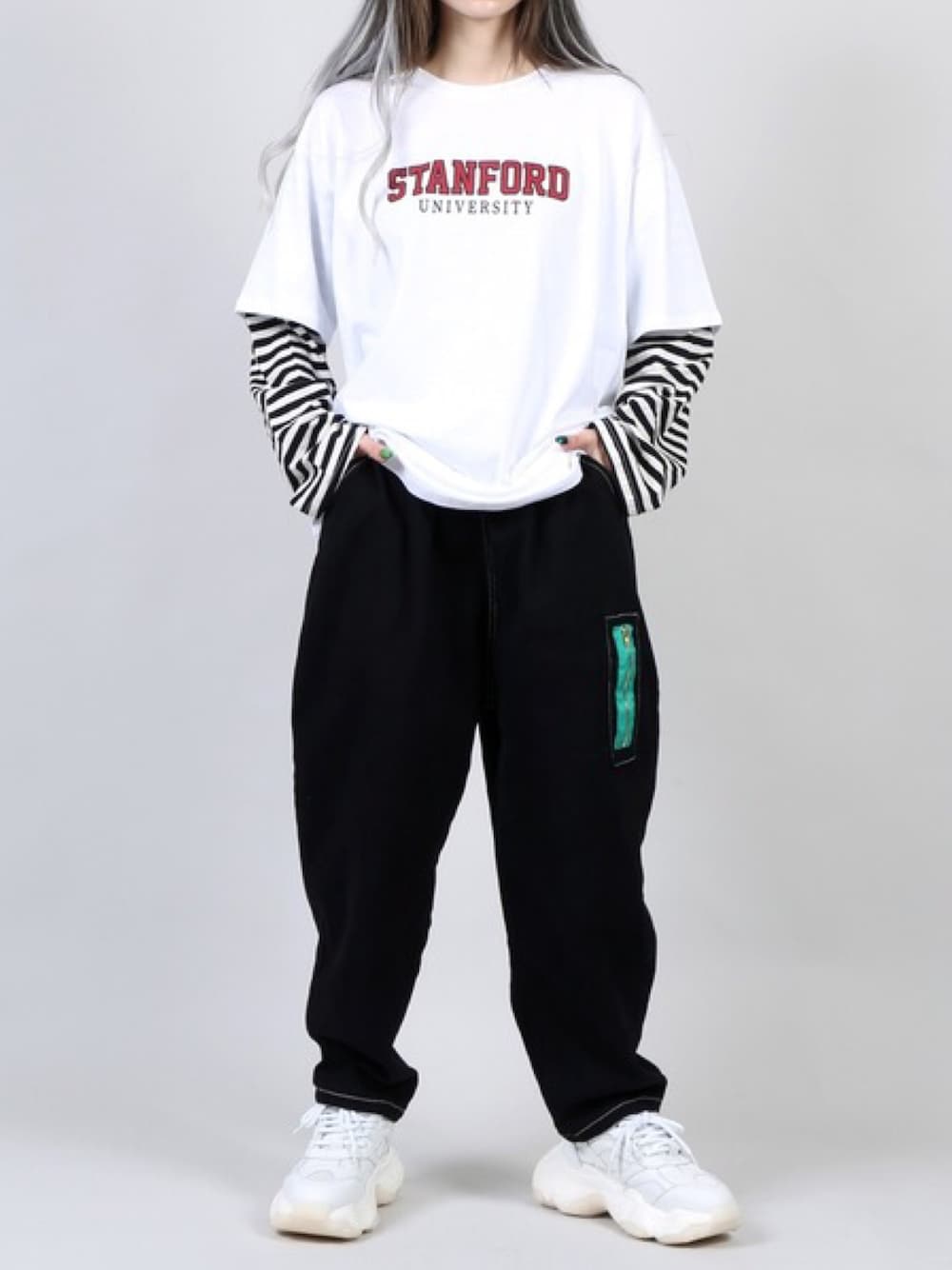 フェイクレイヤードロゴロンT color:white/black size:free ZIPポケットイージーパンツ color:black/beige size:free