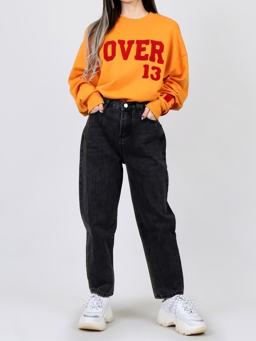 OVER13スウェット color:yellow/blue/gray size:free テーパードデニムパンツ color:black/indigo blue size:small/medium/large