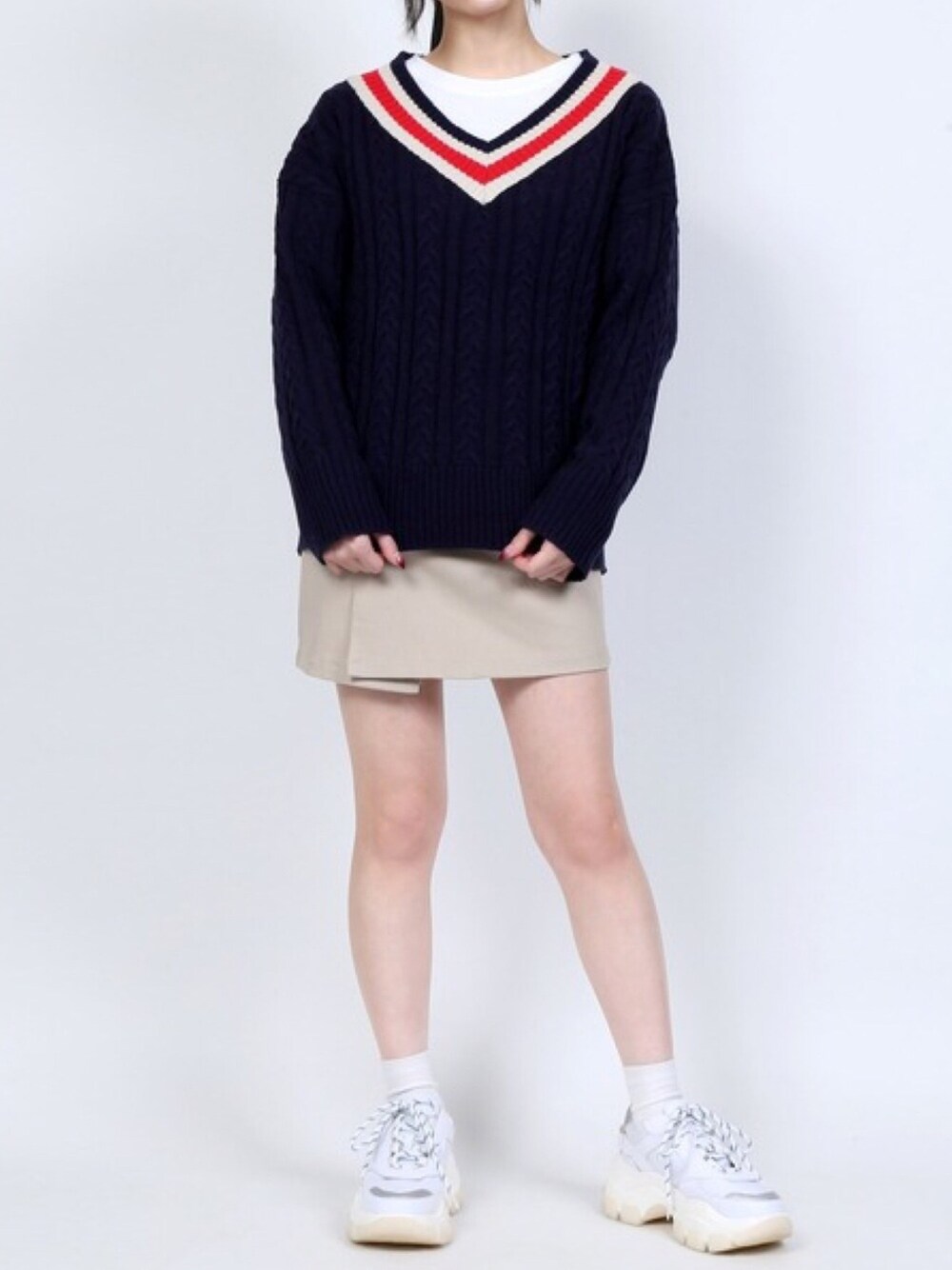 スクールケーブルニット color:navy/beige/green size:free ベルト付きミニスカート color:beige/black size:free
