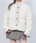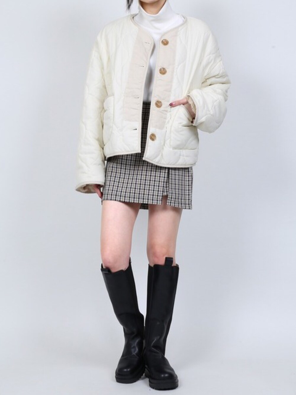 裏ボアキルティングジャケット color:off white/beige size:free ハイネックロングTシャツ color:white/black size:free チェックスリットミニスカパン color:beige/green size:free