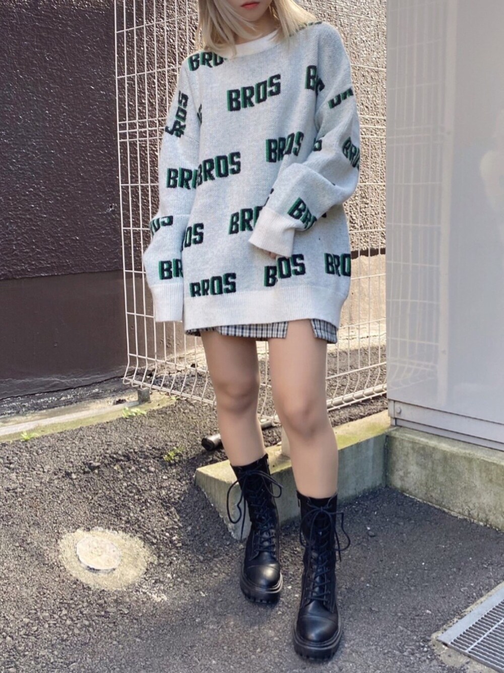 BROSロゴニット color:white/green/black size:free チェックスリットミニスカパン color:beige/green size:free
