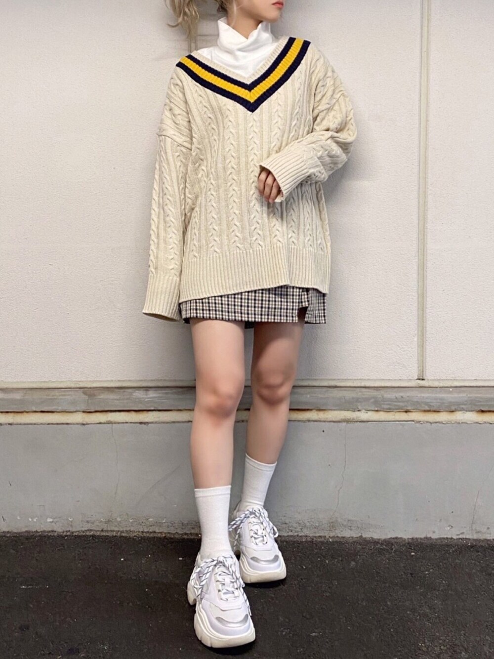 スクールケーブルニット color:beige/green/navy size:free ハイネックロンT color:white/black size:free チェックスリットミニスカパン color:beige/green size:free