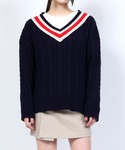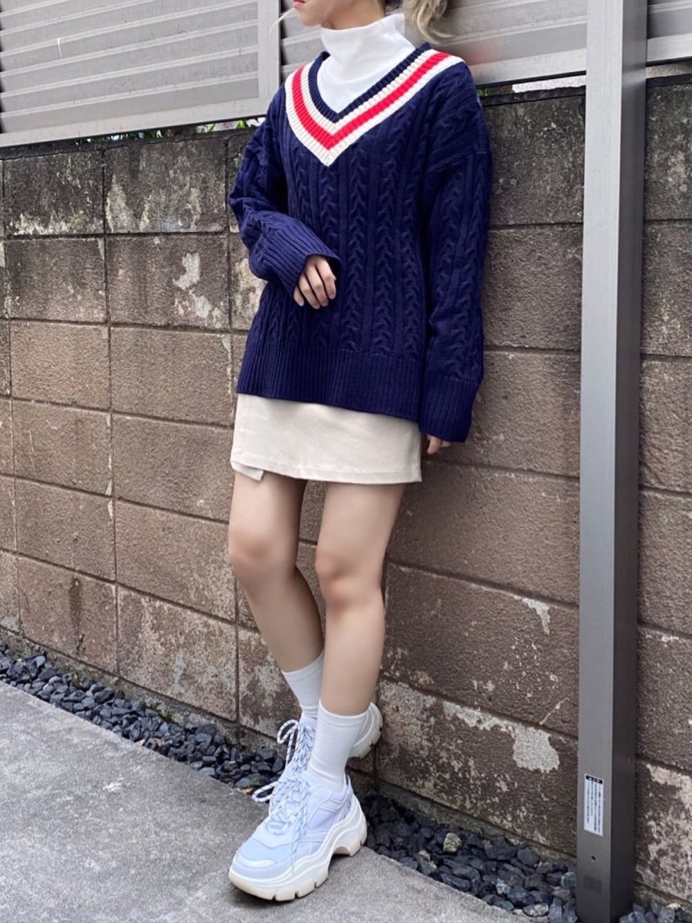 スクールケーブルニット color:navy/beige/green size:free ハイネックロングTシャツ color:white/black size:free ベルト付きミニスカート color:beige/black size:free
