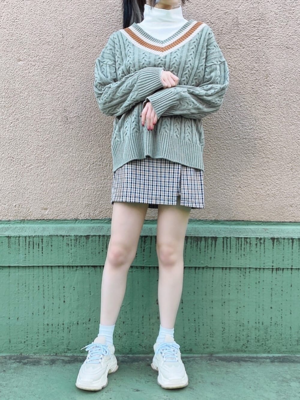 スクールケーブルニット color:green/beige/navy size:free ハイネックロングTシャツ color:white/black size:free チェックスリットミニスカパン color:beige/green size:free