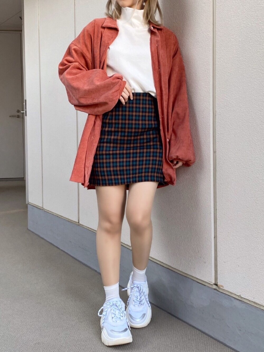 コーデュロイオーバーシャツ color:dark orenge/beige/off white size:free ハイネックロンT color:white/black size free チェック柄ミニスカート color:dark green/beige size:free