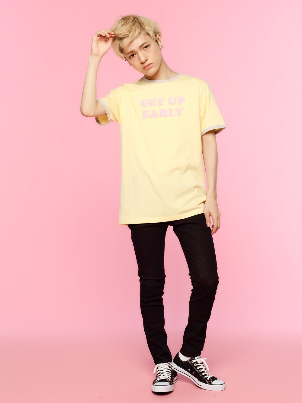 GET UP EARLYリンガーTシャツ color:yellow/black/white size:S/M デニムスキニーパンツ color:black/indigo size:S/M 今季注目のリンガーT♪ ロゴ部分はぷっくりとした 発泡プリント。