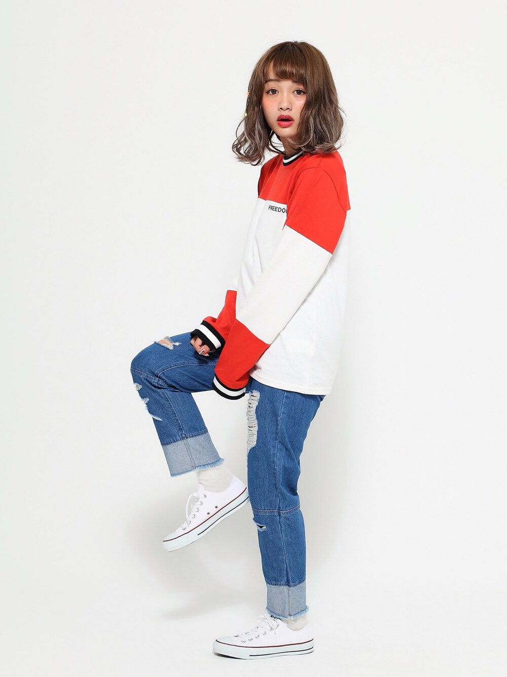 FREEDOMバイカラーロンTee color:red/blue size:S/M 切り替えクラッシュデニムパンツ color:indigo size:S/M 2016AWアイテム★ 販売&予約スタート!!