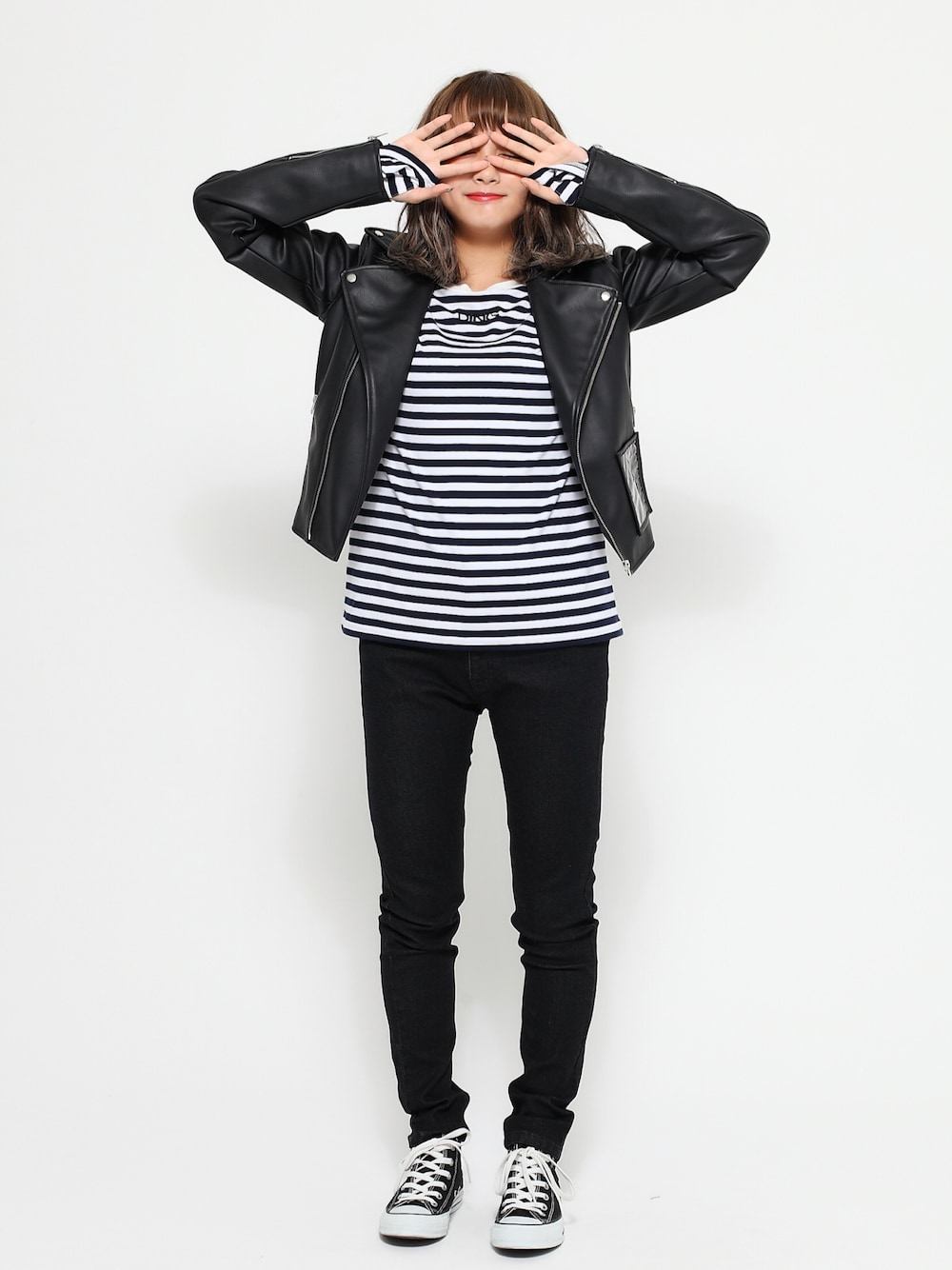 ビニールパッチライダースJKT color:black/pink size:S/M ワンポイントボーダーロンTee color:black/green/pink size:S/M デニムスキニーパンツ color:black/indigo size:S/M 黒でまとめた大人めコーデ✴︎