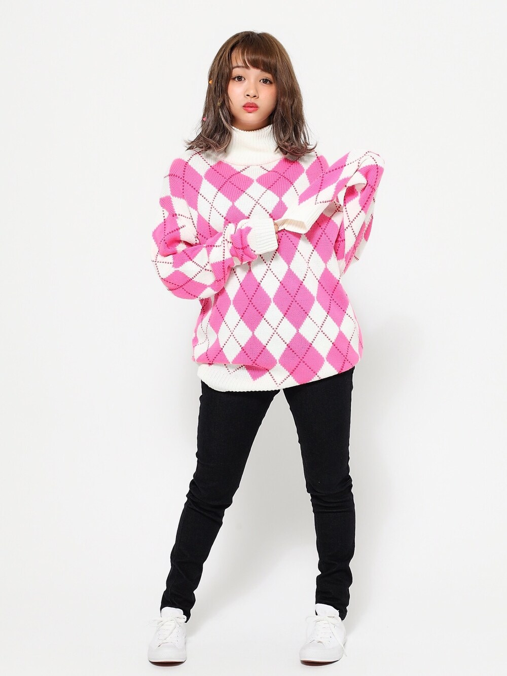 アーガイルハイネックニット color:blue/pink size:S/M デニムスキニーパンツ color:black/indigo size:S/M ニットはダボっとワンピ風に 着るのもオススメ☆