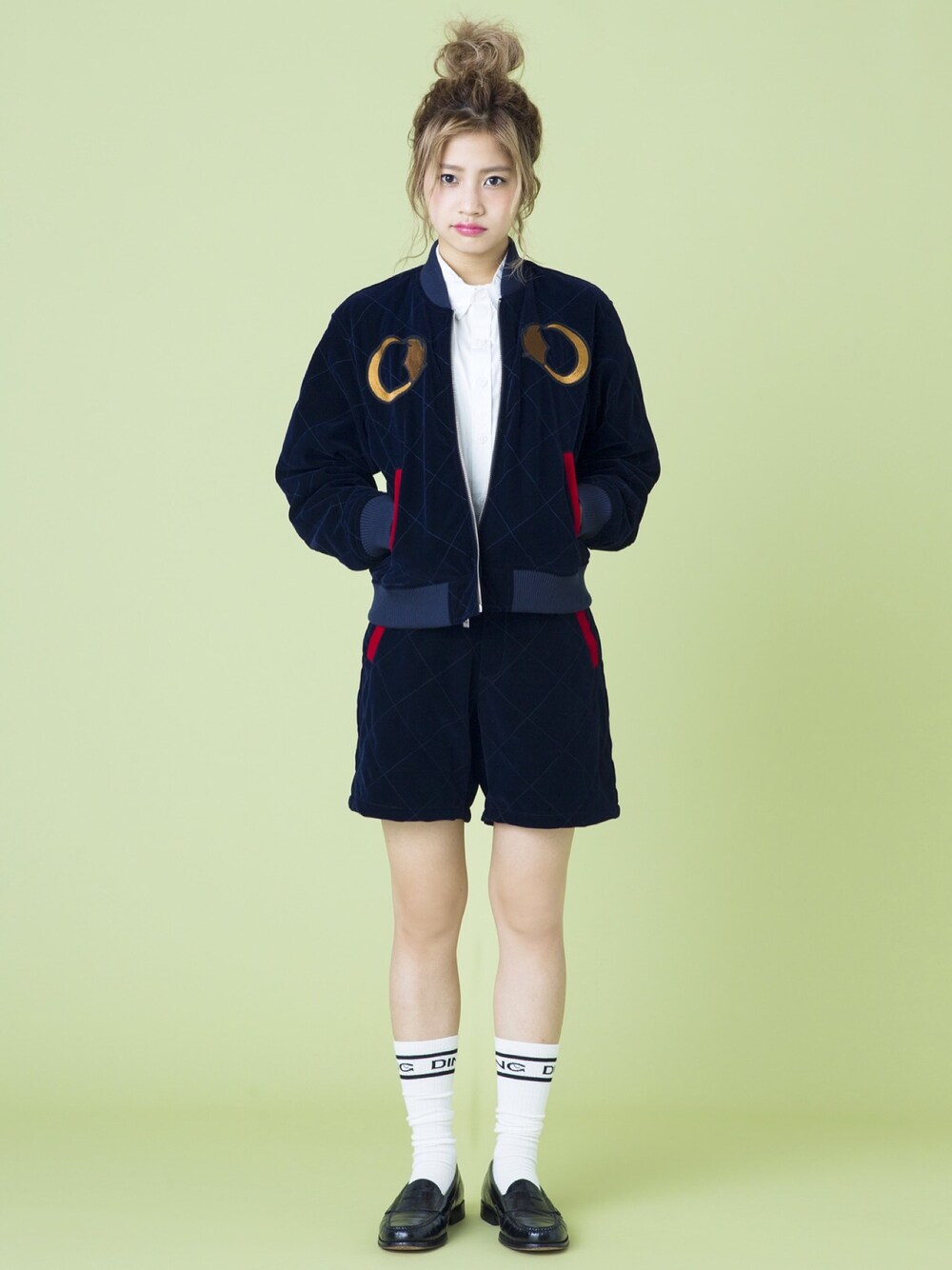 キルティングベロアブルゾン color:brown/navy size:S/M キルティングベロアショーパン color:brown/navy size:S/M ネイビーに赤の挿し色が映える! ブルゾンは軽くて使いやすい♪ 中にパーカーを着てもOK◎