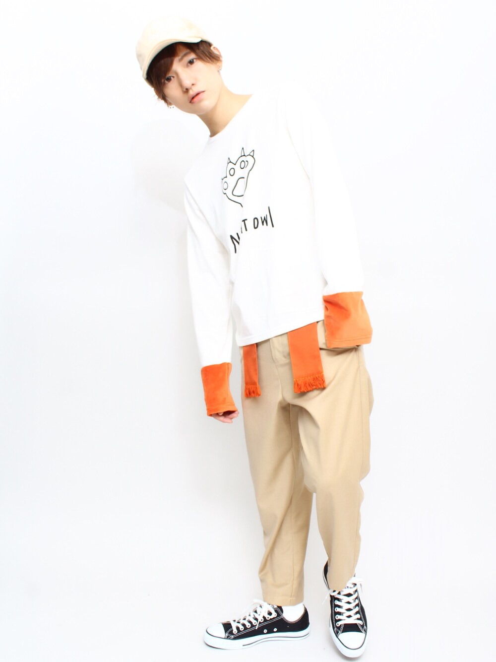 ロゴベロアキャップ color:beige/pink/black NIGHT OWL ロンTee color:white/black size:S/M フリンジベロ付きパンツ color:beige/gray size:S/M ロンTeeの袖はベロア切替★ パンツのベロ部分と色合わせコーデ♪