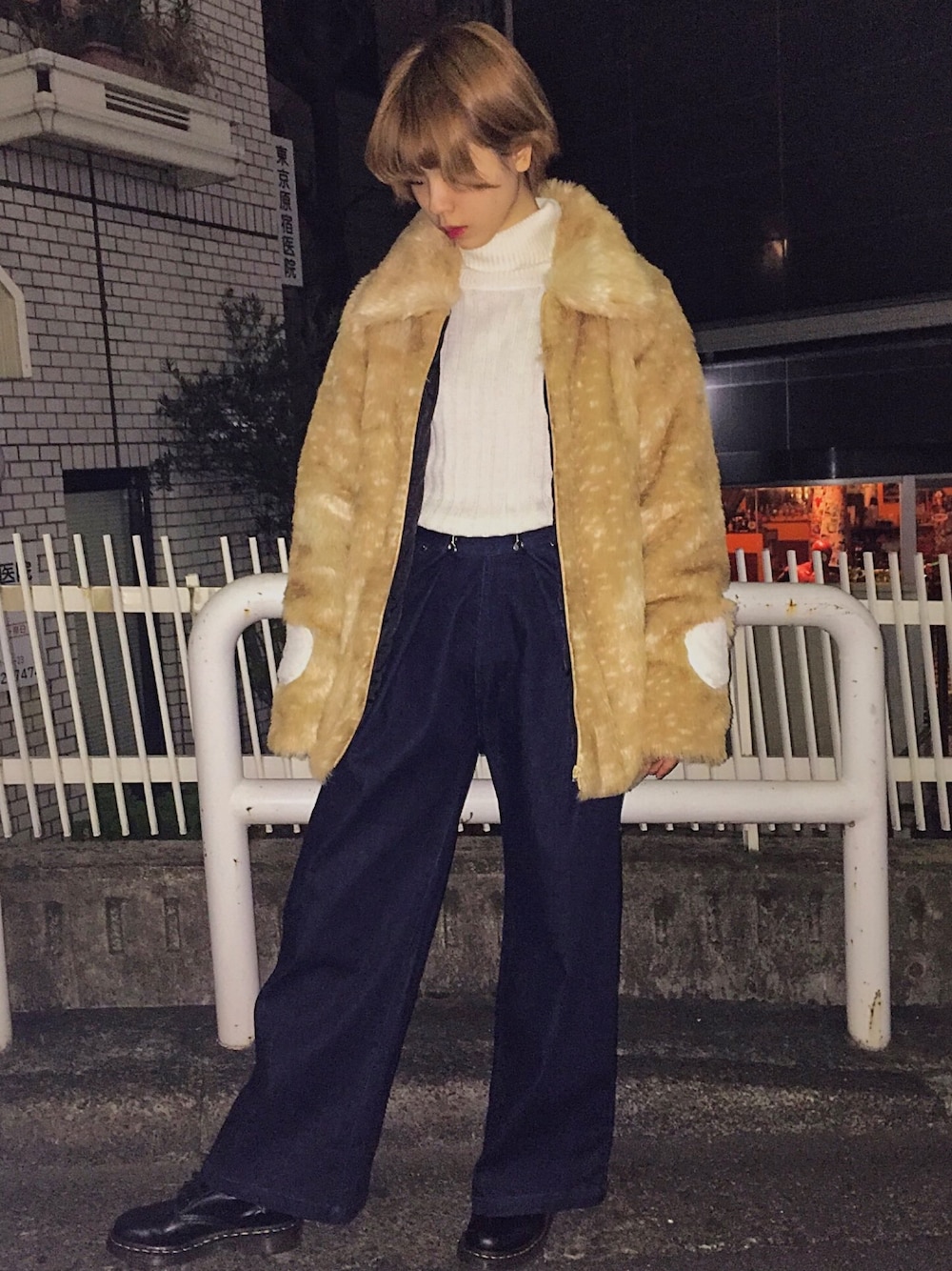 フェイクファーバンビブルゾン color:other size:S/M ワンポイントリブタートルニット color:white/mustard/Dgreen/black size:S/M デニムワイドパンツ color:dark indigo/indigo size:S/M バンビ柄のフェイクファー♡♡ ふわふわで暖かい♪ 冬にぴったりのブルゾンアウター!!