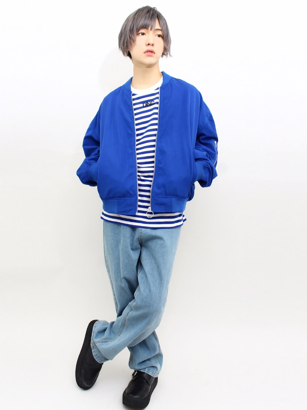 ビッグMA-1 color:blue/l.pink/khaki/black size:L/XL ワンポイントボーダーロンTee color:blue/black/red size:S/M ブルーカラーで コーディネート♪♪ DINGのMA-1は春先まで使える 優秀アウター!!