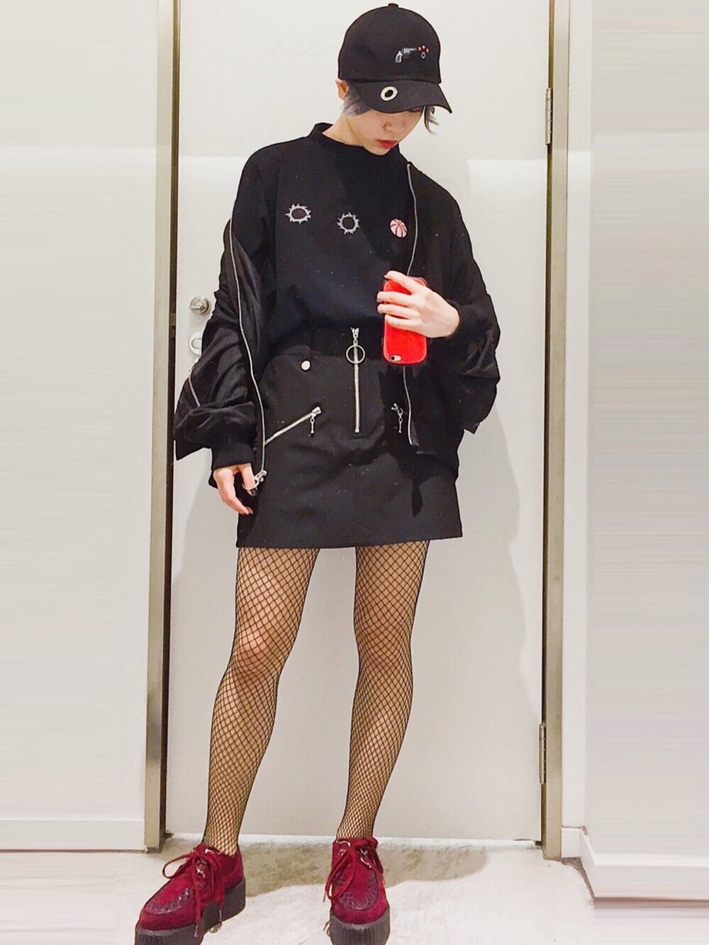 刺繍ハイネックカットソー color:black/red size:Free ZIPミニスカパン color:black/dark indigo size:Free アメ玉の銃弾に弾痕。 sweets gang。 黒✖︎赤。