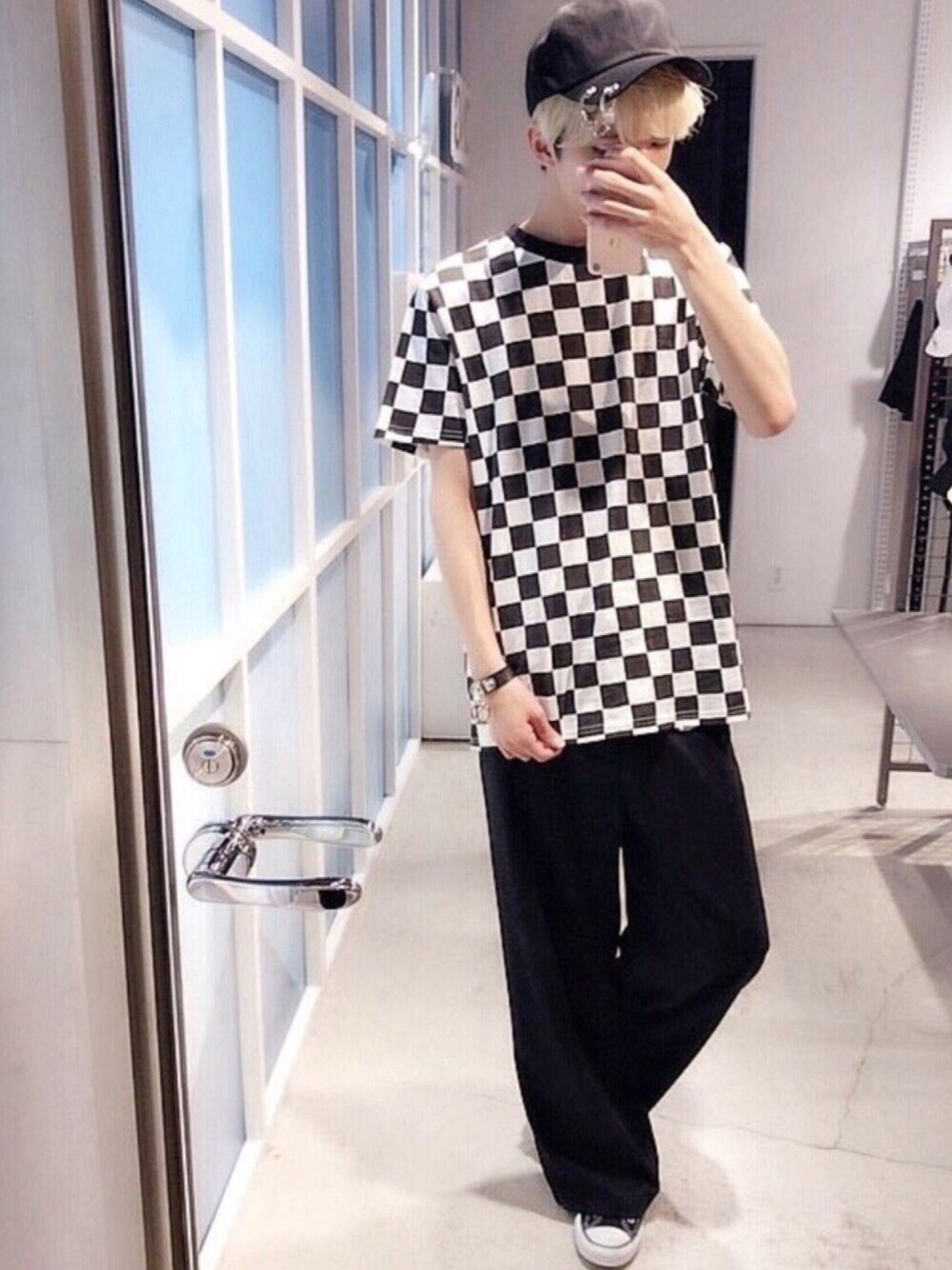手錠CAP color:black/white size:free チェッカーフラッグTシャツ color:black size:S/M ベルト付きワイドパンツ color:indigo/light indigo/black size:S/M モノトーンカラーでまとめた ストリートスタイル♪