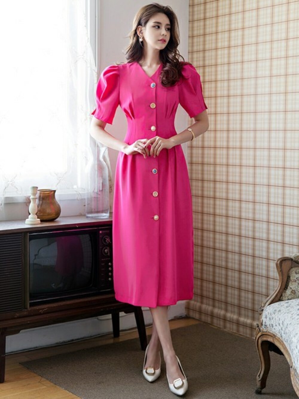 DINTのワンピース「ビジューボタンパフロングワンピース」を使ったコーディネート