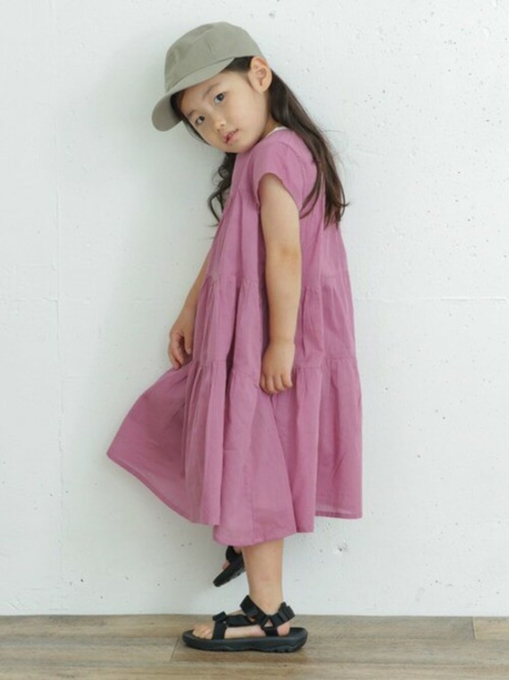 女子の心を鷲掴みするたっぷりティアードが可愛いワンピースを使ったカジュアルコーデ。 キャップ×スポサンで元気に遊ぶ日もお洒落を楽しみたいキッズにおすすめ♪