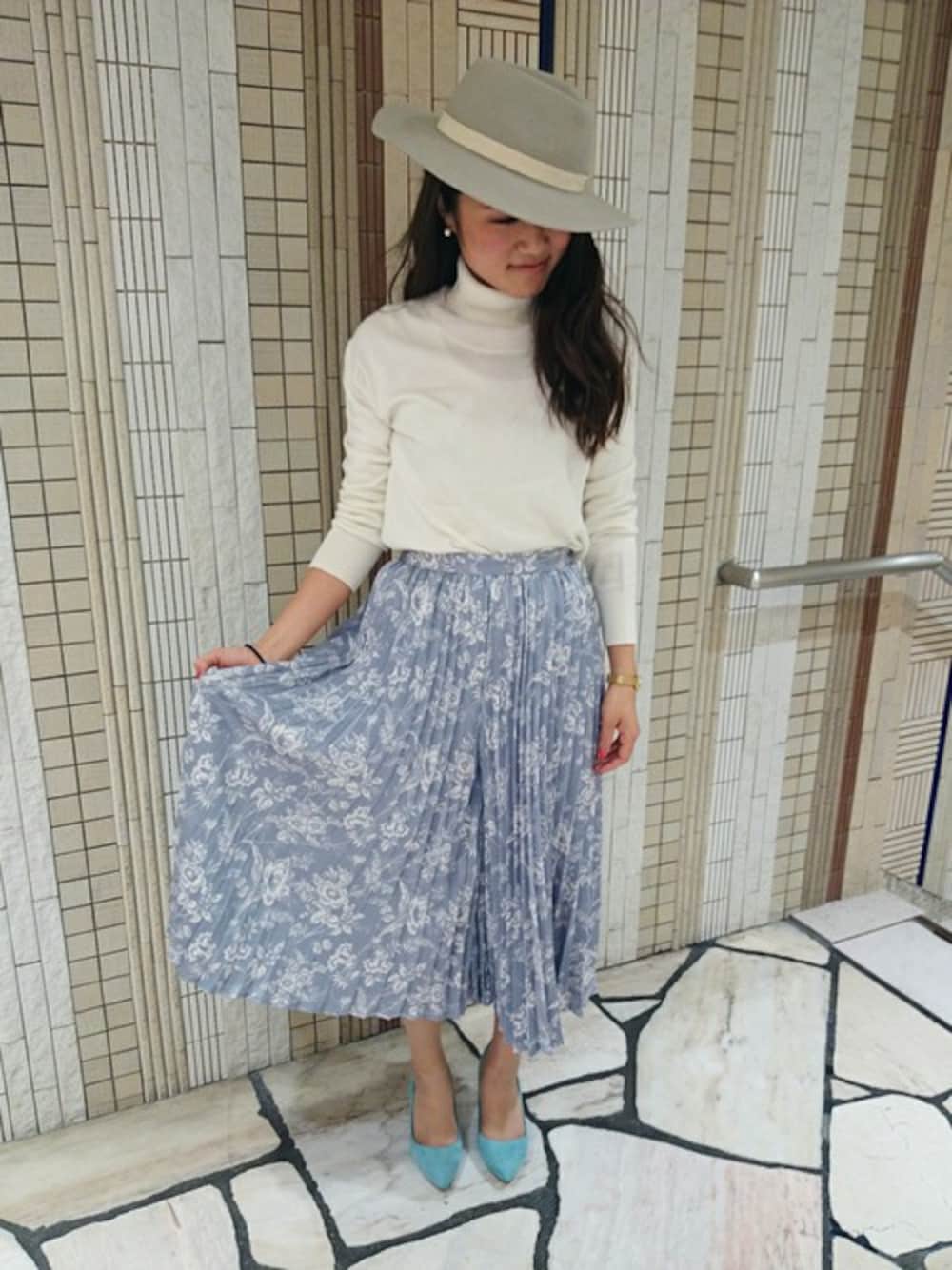 繊細なボタニカル柄のガウチョパンツで、レディなコーディネート。 ホワイトを基調に、春を感じる淡い色でまとめました。 今シーズンのプリーツガウチョは足首が見えるすっきり丈で、軽やかで春らしい雰囲気。ふわっと広がる裾のラインもお気に入りです。 フラワープリントなど、柄のアイテムを取り入れることで今年らしいスプリングスタイルが完成します♪