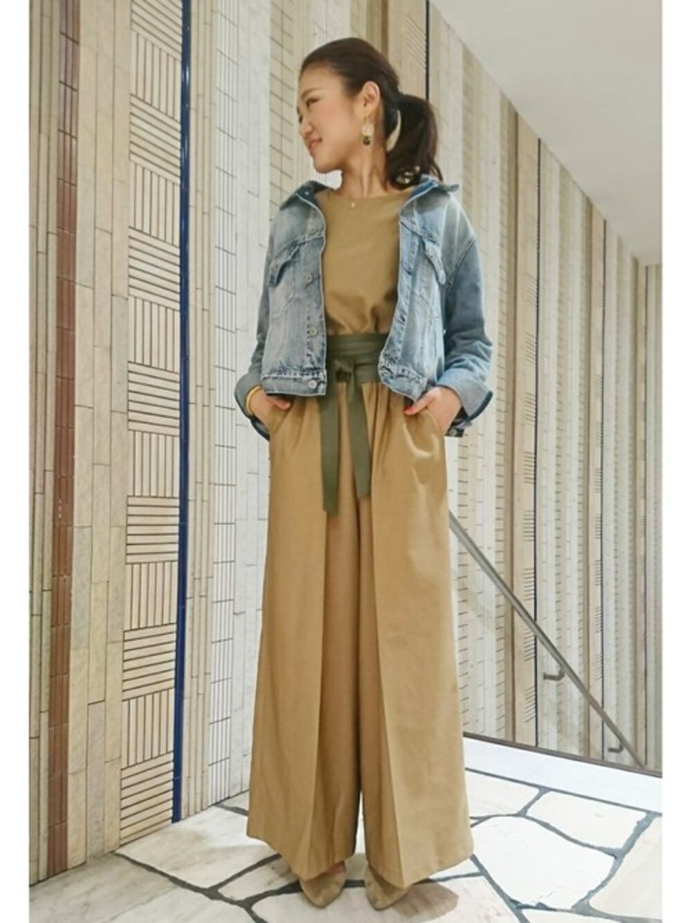 暖かくなってきたので、デニムジャケットで春コーデ。 オールインワンはシンプルな大人っぽいシルエットが魅力的です。 今年はオールインワンやワンピースにはワンポイントでサッシュベルトをプラスするのがオススメ!スエード素材のサッシュベルトなら、落ち感があって大人っぽく仕上がります!