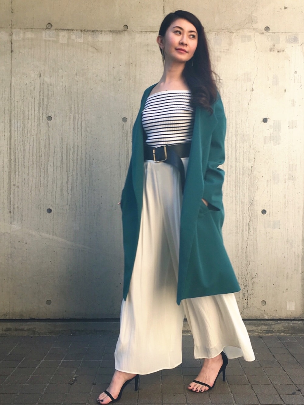 #ootd #outfit 季節は春だっ🌼 ウールコートはもう飽きたから 颯爽とボタンレスコート✨ このグリーン 明る過ぎず、深過ぎずで良い色! 1枚でキマるコート🤔✨ 写真は夕暮れで良い感じのライティングに😆