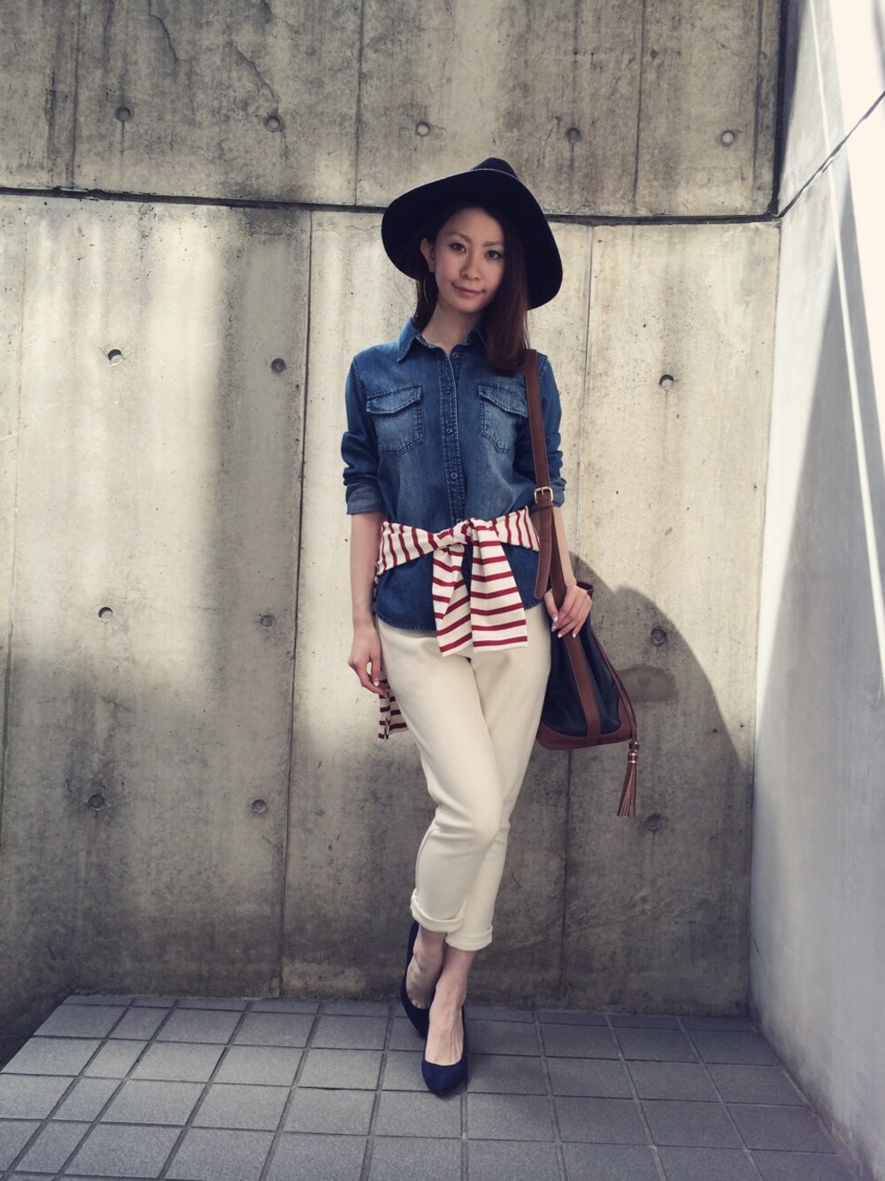 デニムシャツには スキニー風スエットパンツで カジュアルながらも タイトラインでStyleUP✨ ボーダープルオーバーを腰巻きにして さらに引き締めます ハットと巾着バッグを合わせたら こなれ感もプラス!