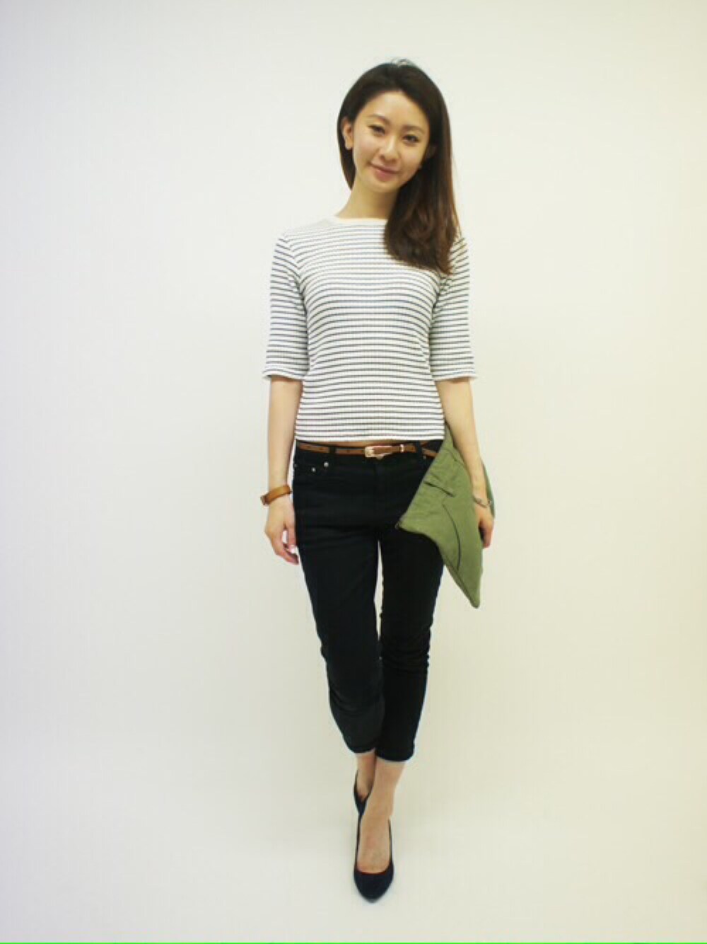 ボーダートップスは シンプルなコーディネートで Styleアップ✨ トップスはクルーネックと5分丈袖がカジュアルな中にもミニマルで女性らしい印象。 リブ素材はすっきりしたラインを実現。 パンツはブラックのスキニーパンツで 気取らない、さりげなさのあるおしゃれ感を。 ミリタリーのクラッチバッグがトレンド感、こなれ感を演出してくれます✨