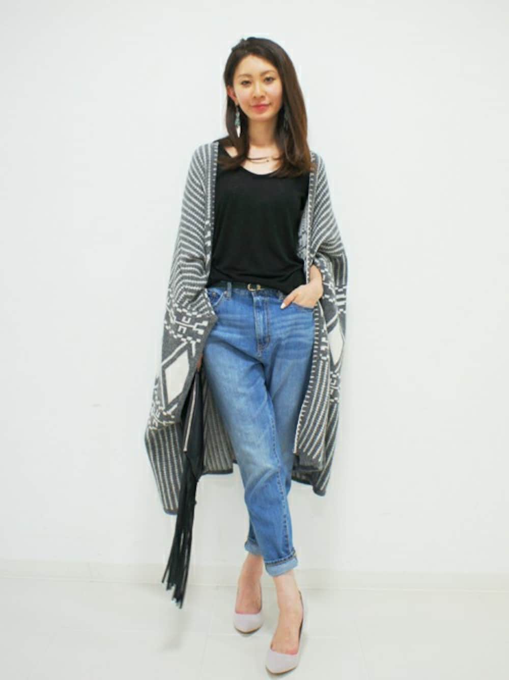 トレンドのボヘミアン調のニットガウンは、 1枚でインパクトのあるデザイン。 そのため、他はシンプルなアイテムでスタイリングしました。 中のTシャツは着心地がよく、色違いで持っているお気に入り。 ヴィンテージ感のあるデニムは、ハイウエストでスタイルよくきまる1枚です!