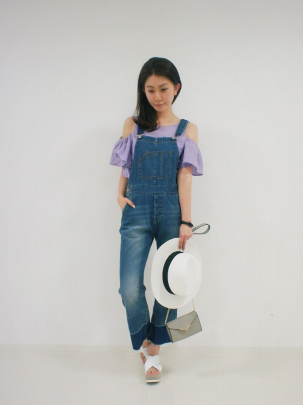 ひとつ前にアップした カラーシャンブレー2wayブラウスの オープンショルダーコーデ✨ 裾の配色カラーがポイントの デニムオーバーオール、 70sな雰囲気に オープンショルダーの肌見せ感を 取り入れて 女性らしさを楽しめるStyle✨