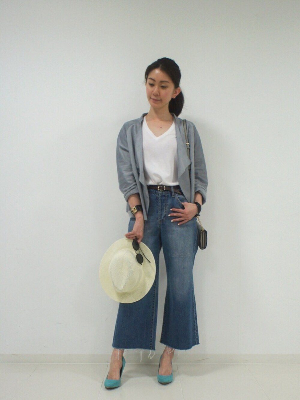 全体をブルーカラーでまとめつつ、 Tシャツにホワイトを入れることで 抜け感、カジュアル感を✨ 今年らしいクロップドの フレアデニムパンツには 女性らしいパンプスで すっきりな印象に!