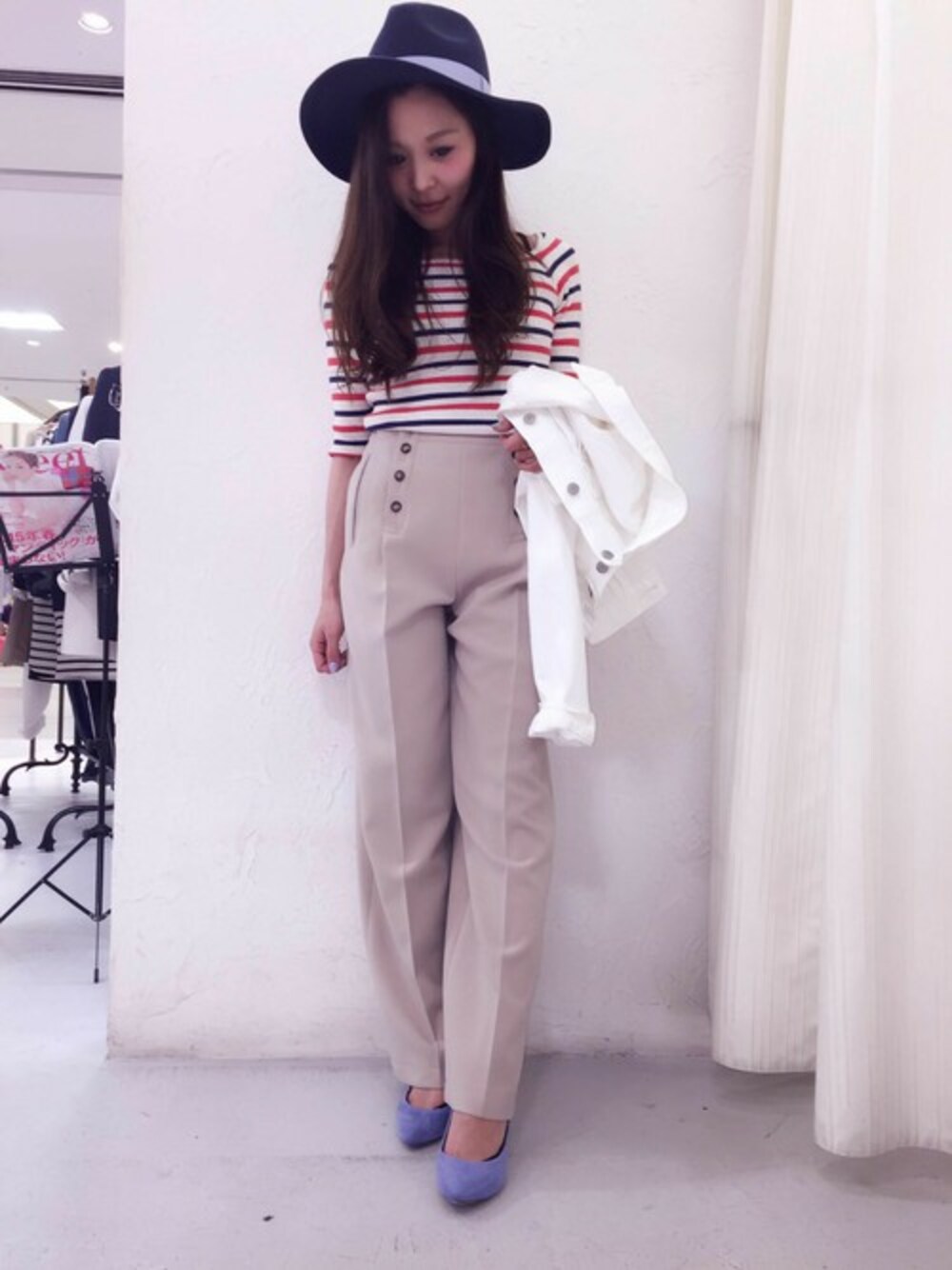 オフショルダーデザインのリブ編ニットプルオーバーをワイドパンツにINした、大人のマリンコーディネート★ トップスはボディラインを沿うタイトシルエットで女性らしさがありつつも、春らしいボーダー柄でカジュアルな雰囲気もあるアイテム。 ボトムはハイウエストに仕上げたデザインで「きちんと感」もプラスでき、今期トレンドのマストバイアイテムです。 デニムジャケットはダブルボタンで、印象的な襟元のラインは着用した時に丸みを帯びて、女性らしい印象になるように計算されたカッティングです。 ワイドパンツはボリュームがあるので、トップスはコンパクトにするためにウエストインでバランスを取り 小物はマリンカラーなブルー系で揃えるのがオススメです★