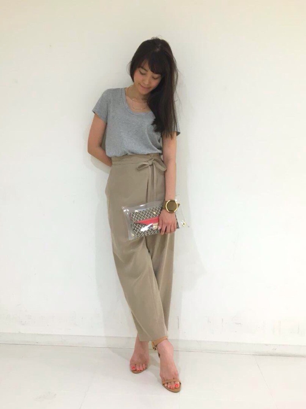 リラックス感のあるラップフロントのパンツはベージュをチョイス。 あえてゆるっとしたグレーのスラブTシャツに合わせて。 足元は肌なじみのよいベージュのアンクルサンダルで抜け感をさらにプラスしました。