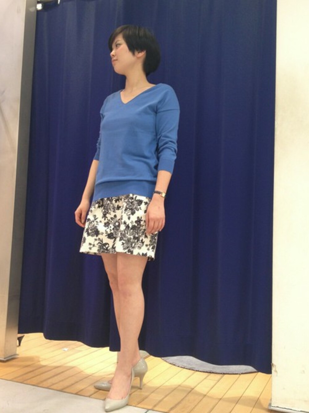 花柄のスカートにブルーのニットを合わせ春らしいコーディネートに。