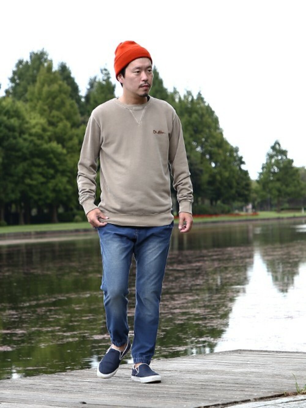 独特な風合いのスウェットがポイント。 オレンジのニットキャップがアクセントになる、秋のコーディネートです。
