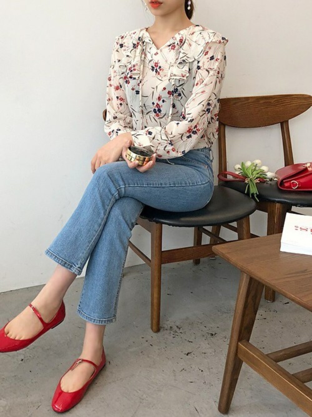 ふんわりとロマンチックな着こなしを叶えるフラワー柄ブラウスと、 着痩せ効果抜群のセミブーツカットデニムパンツをコーデし、 大人ガーリーなルックに完成しました。 耳元に揺れるドロップキャンディのような可愛らしいピアスは、 存在感のあるフォルムでコーデのアクセント使いにぴったりです。 足元のエナメル風のグロッシーな光沢感のあるフラットシューズは、 細身のストラップにアーモンドトゥがキュートながらもちょっぴり大人な色気を演出します。