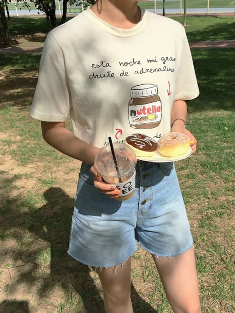 ベーシックなカジュアルコーデに欠かせないシンプル半袖Tシャツ☆ ボディラインを拾わない、一枚持っているとコーデの幅が広がる優秀アイテム。 フロントに施されたプリントでインパクト大です! Tシャツにはやはりデニムショートパンツ! センターに並んだ4ボタンでウエストがさらにほっそり見える効果も◎ レッグラインをアピールするショートな丈感で、ハイウエスト仕様なので脚長効果絶大。 この夏を楽しむコーデが完成☆