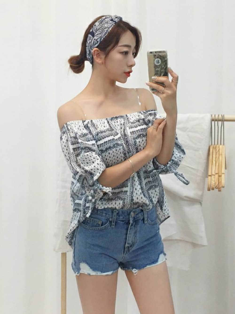 爽やかなバンダナ柄のオフショルブラウスが新登場!! 袖口にはストラップを添えてふんわりボリューミーなシルエットを演出☆ ラブリーな肌見せアイテムで色っぽスタイルを叶えます♬ ボトムスはハイウエストクラッシュデニムショートパンツ★! インパクトあるダメージディテールでオシャレなポイントに◎ 色落ち感とクラッシュがヴィンテージな印象を与えてくれます☆ ハイウエストなので 脚長効果も抜群!!☆ この夏に欠けないスタイリッシュコーデ完成♥