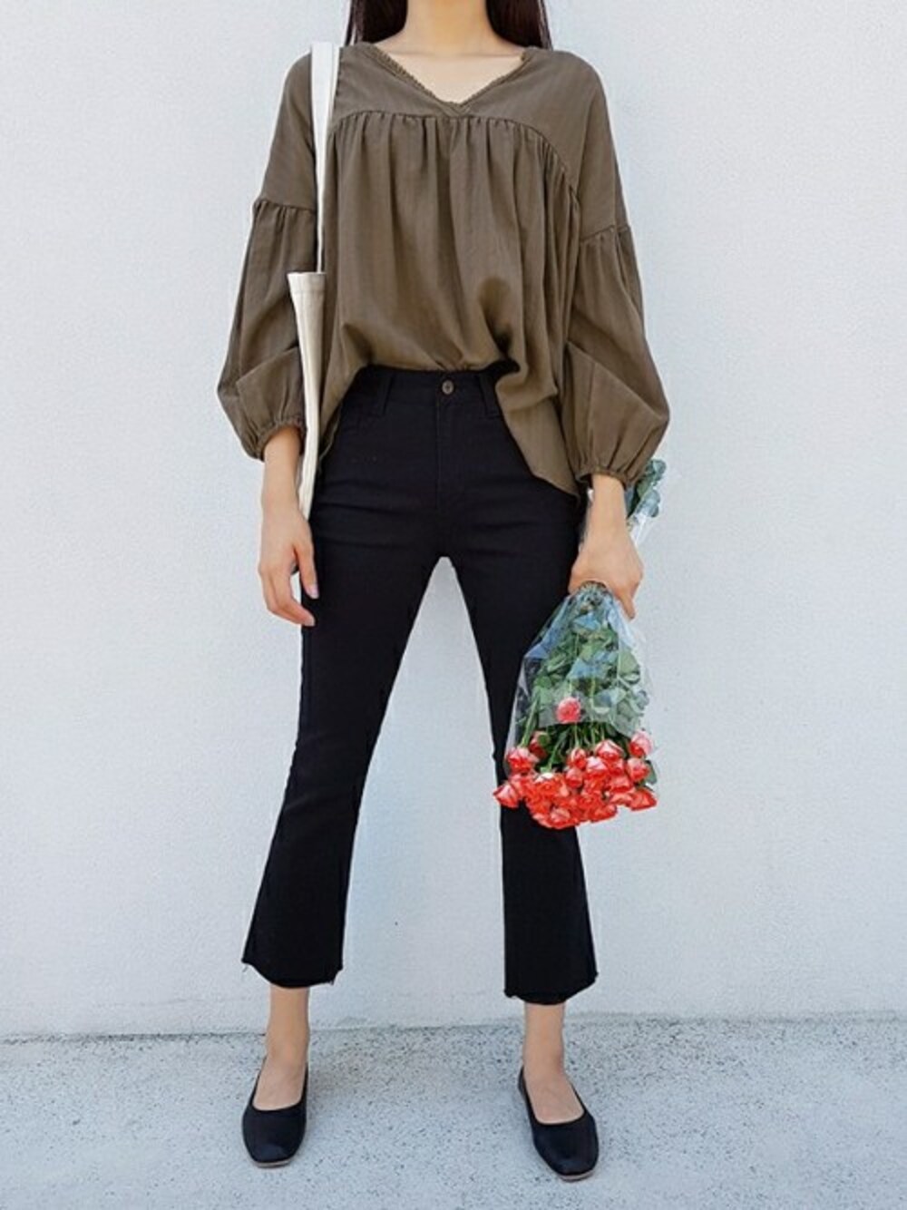 ラブリーなVネックブラウスとトレンディなセミブーツカットパンツのマッチングで、お出かけに最適♪ ブラウスは胸元からギャザーに切り替えてふんわりボリューミーなシルエットがポイント☆ 広がりを抑えたさり気ないブーツカットラインのパンツを合わせるだけでフェミニンなコーディネートが完成します★ ポイントのあるブラウスがぐっと引き立つため、足元はベーシックなスクエアトゥのフラットシューズをCHOOSE❤ フレンチロゴがアクセントになっているトートバッグをプラスして、オシャレ指数がアップ☆ デートルックにびったりなスタイリングで、女子力アップのGOOD CHOICEに間違いなし★