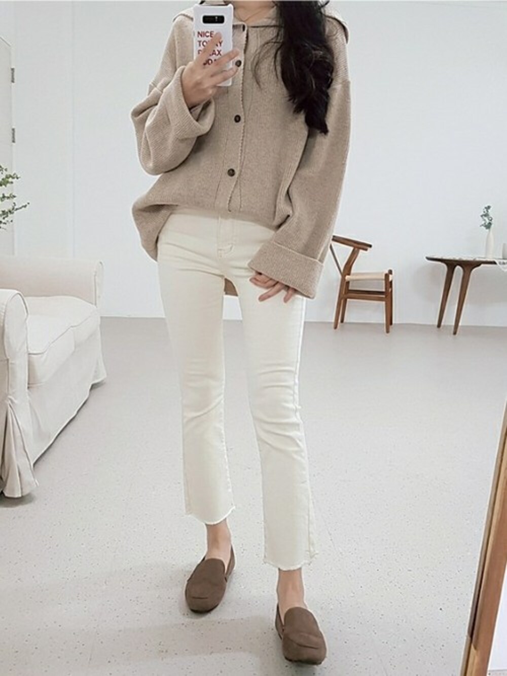 秋冬本命のカラーになるベージュのカーディガンをご紹介します💜 ビックシルエット気味でざっくり着こなせるので、大人のシンプルベーシックスタイルにおすすめ🙌 丈が長めなので、リラックス感や余裕を感じさせるアイテムといえるでしょう💎💎 ボタンを全部クロージングしてネック部分を一度折ると、 首まで温かく包んでくれるハイネックガーディガンに演出可能🙋 写真のようにボタンを二つオープンしてセラカーディガンの感じで着ても👆 女性らしいムードぐっと溢れるヨリヨリコーデを完成😍 タイトなブーツカットパンツとも相性抜群のゆるシルエットのカーディガン🎵 足元はシンプルスタイルも格上げしてくれる高級感のある質感のフェイクスエードローファーです🍇 秋冬はこのカーディガンで、おしゃれでポイントのあるコーデを楽しんでみてくださいね👍👍