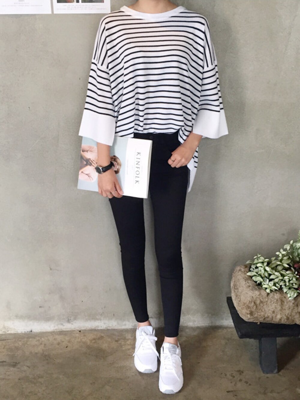 DAILYABOUTのニット/セーター「ドロップショルダー7分丈ストライプニット」を使ったコーディネート