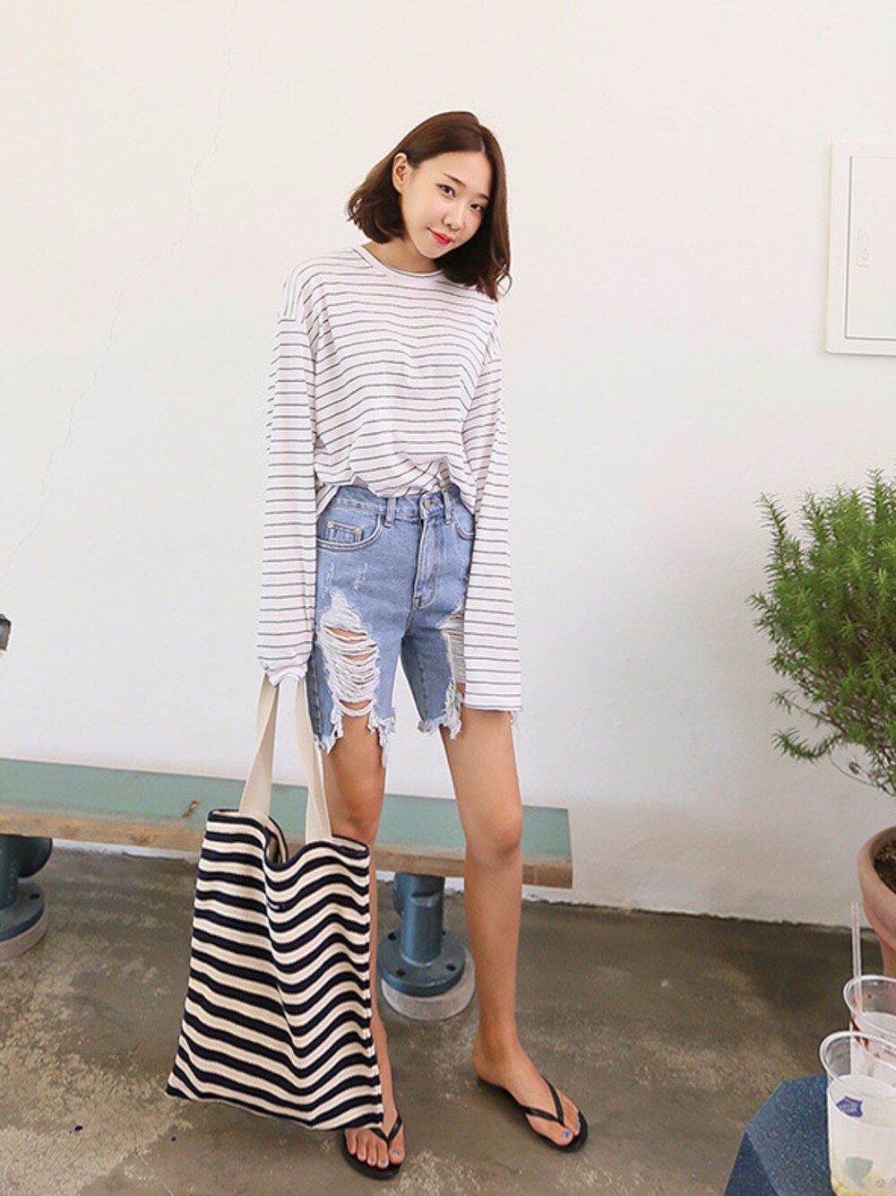DAILYABOUTのTシャツ/カットソー「ラウンドネックドロップショルダールーズフィットボーダー柄Tシャツ」を使ったコーディネート