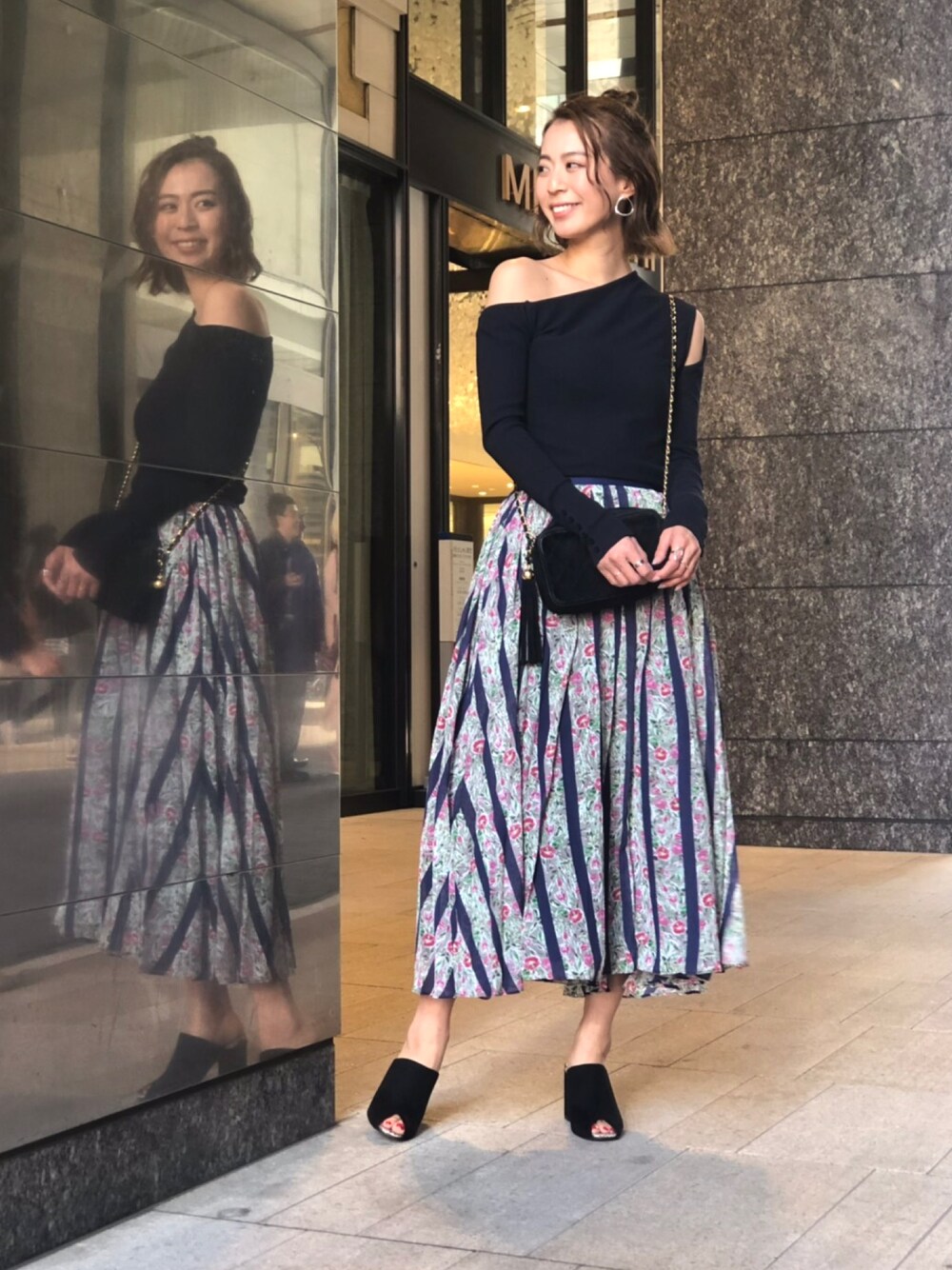 フラワー×ストライプが新鮮なプリーツスカート。アシンメトリートップスと合わせて旬なコーデに。