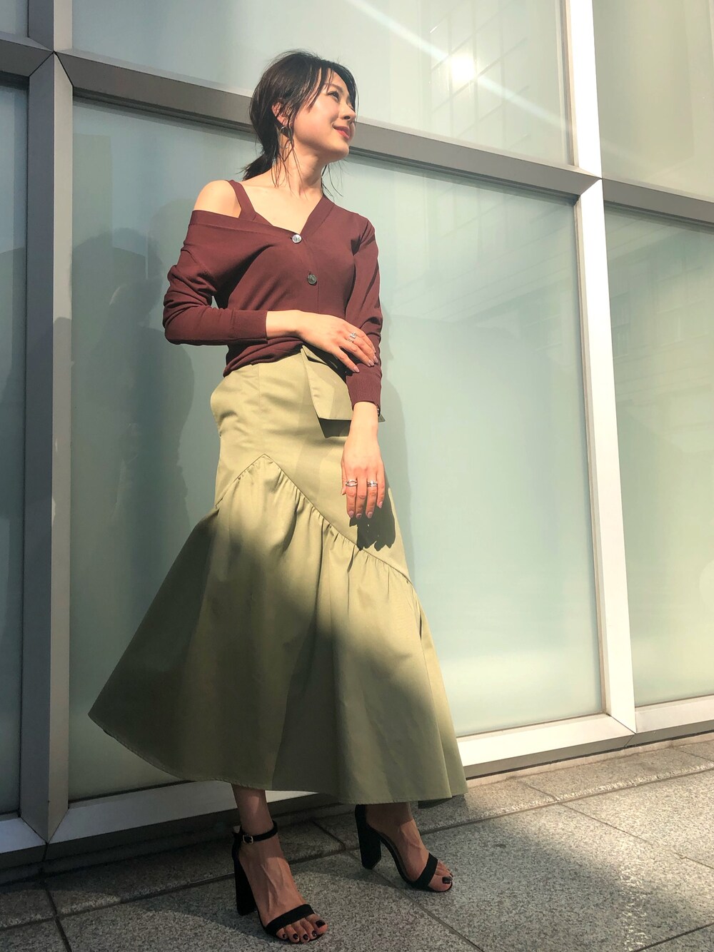 落ち着いたブラウントップスにカーキスカートを合わせた大人スタイル。ウエストバックがキャッチーなポイント!