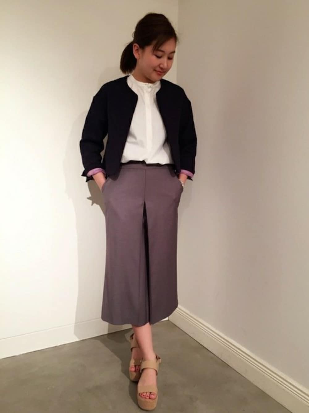 モノトーンでまとめたきちんと感のあるスタイリングですが、ジャケットの袖を折り返してパープルをチラ見せ。 足元はウッジのサンダルで抜け感をプラスしました。