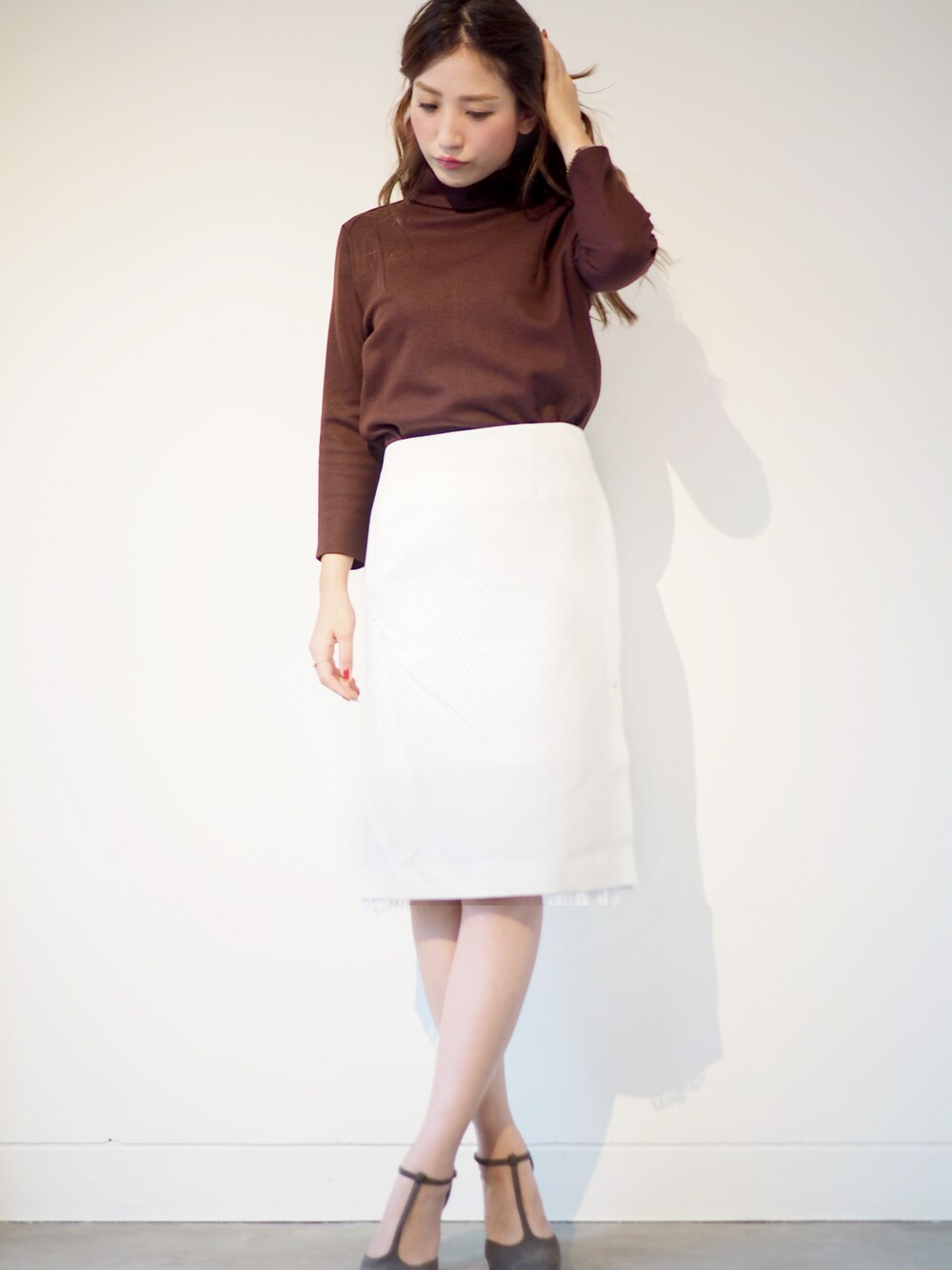 秋冬のコーディネートには、ホワイトアイテムを取り入れると全体がパッと明るくなります! このタイトスカートは、サイドのフリンジが動くたびに揺れてとっても可愛い♡ フリンジアイテムは一点投入するだけでトレンド感がUP!