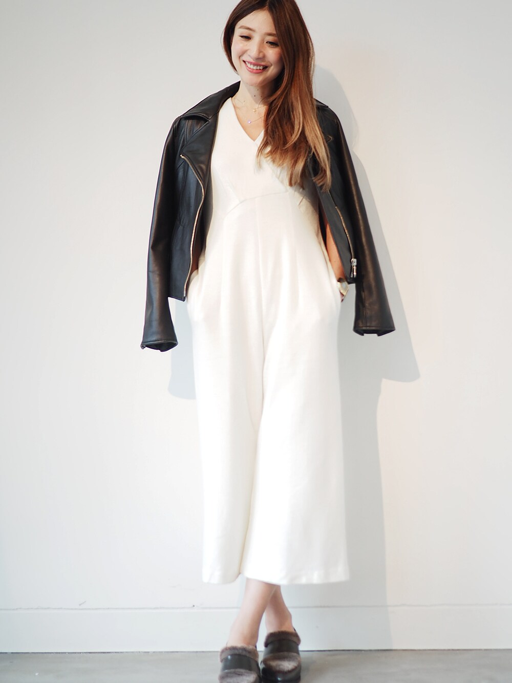 カシュクール風のデザインが新鮮なジャンプスーツはウエストが絞られているのでスタイルアップ効果もアリ! 真っ白なジャンプスーツにライダースブルゾンを合わせて甘辛MIXコーデに仕上げました。 素材もウールなのでこれからの時期でも暖かく着られます♡