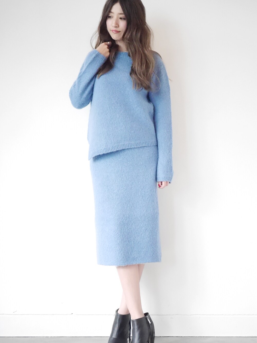 鮮やかなブルーが印象的なニットトップスとニットスカートをセットアップでコーディネート♪ トップスは裾がアシンメトリーなデザインになっているので、裾を出したままでもサマになります。 それぞれ単品使いもできるので着回し力抜群!!