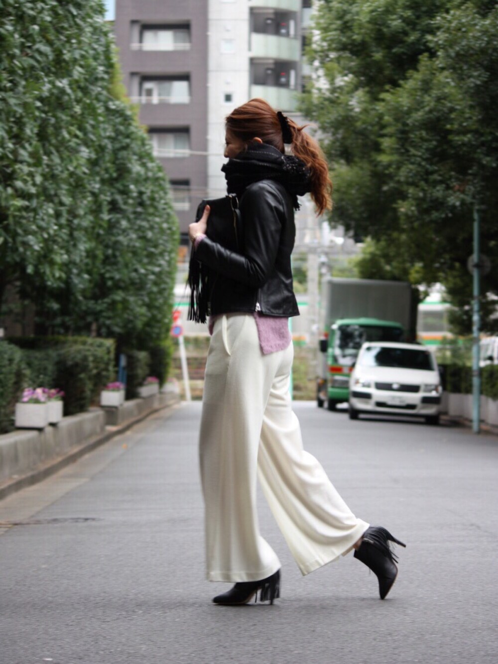 辛口なライダースジャケットに真っ白なニットカットソー生地のパンツを合わせました♪ 中に着た裾がアシンメトリーデザインのピンクのニットトップスをジャケットからチラ見せしているのがポイント♡
